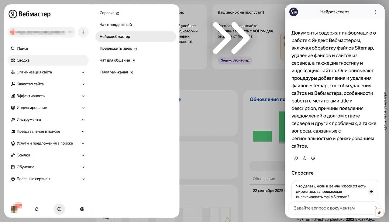 Нейровебмастер имеет доступ ко всей Справке и базе знаний поддержки Яндекса. Это означает, что он «знает» не только теоретические основы SEO, но и практические нюансы работы с конкретными инструментами платформы.