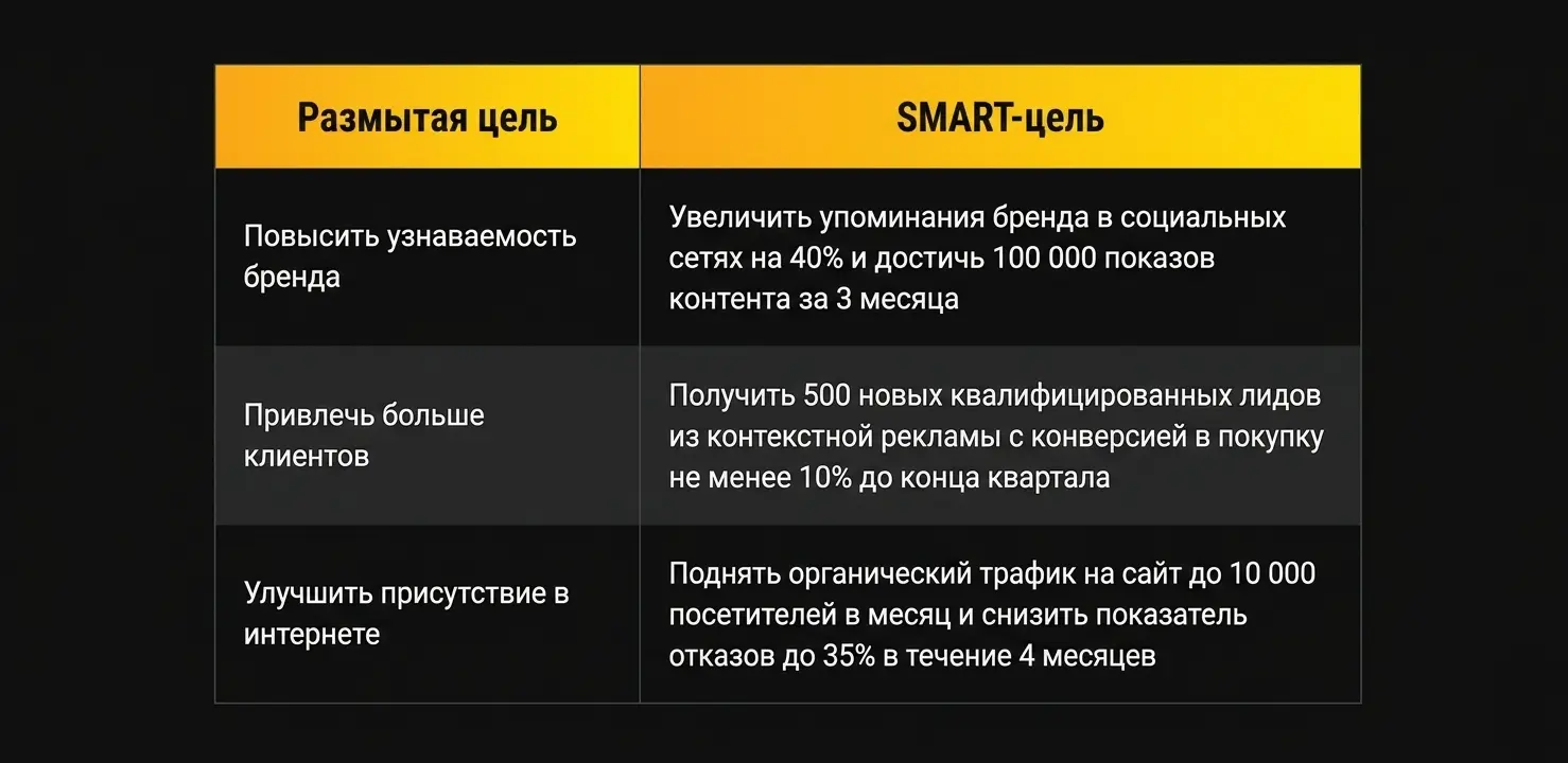 Распространенная проблема заключается в том, что многие компании формулируют свои цели слишком расплывчато: «увеличить продажи», «повысить узнаваемость бренда» или «привлечь больше клиентов». Такие размытые формулировки не дают понимания, к чему именно нужно стремиться и как оценивать результаты.