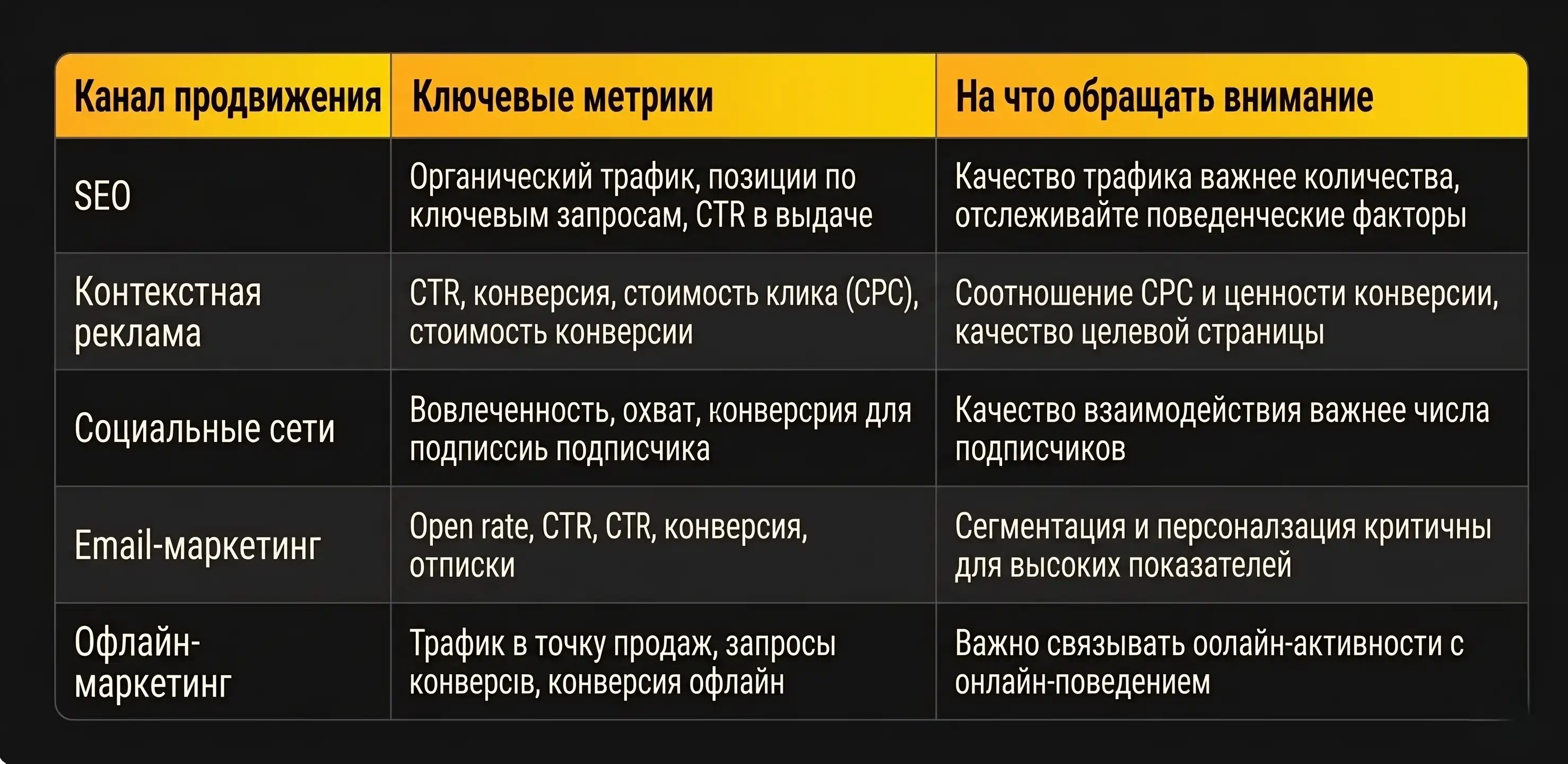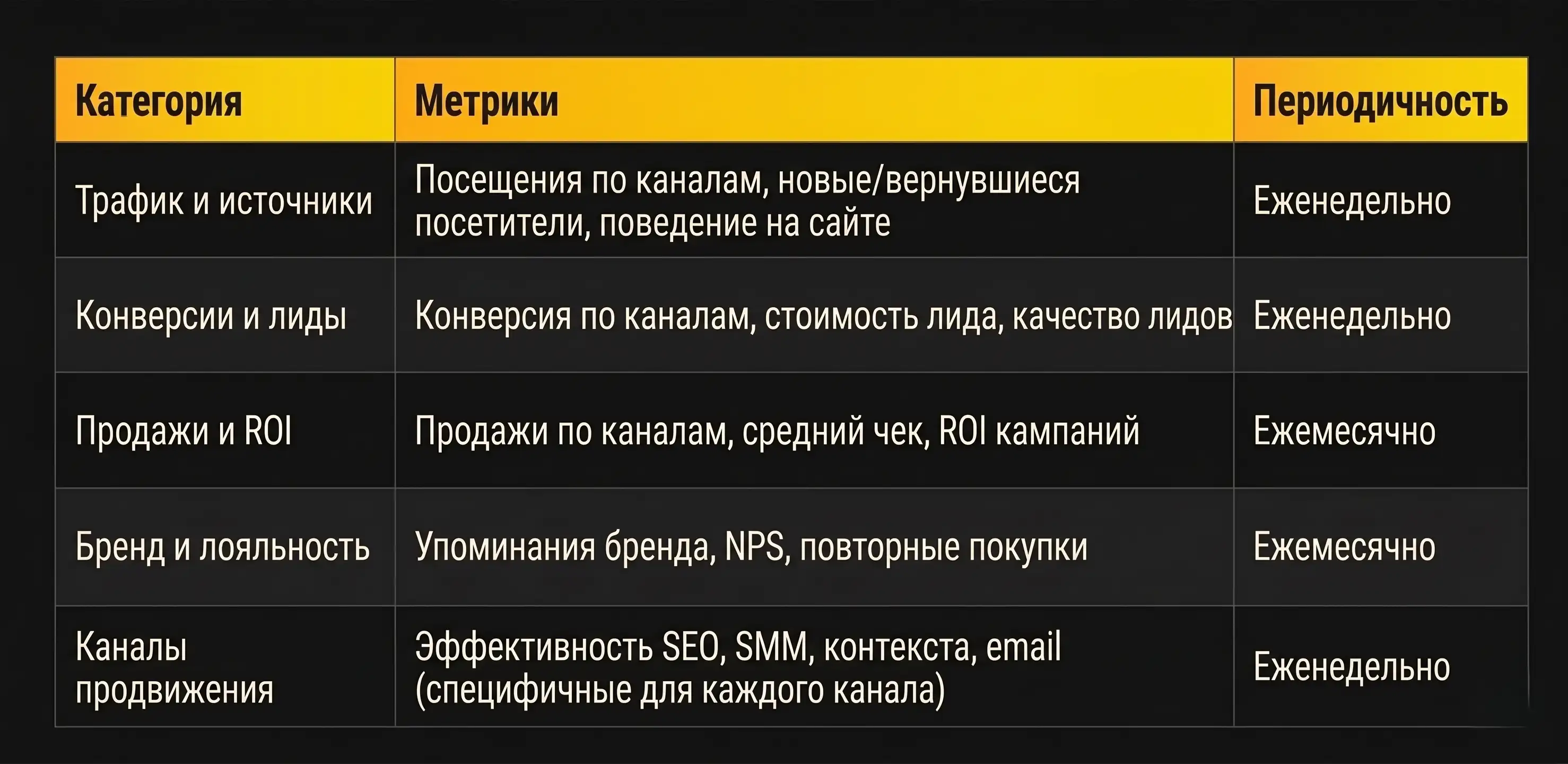 - Отслеживаем ли мы ключевые метрики по каждому маркетинговому каналу?