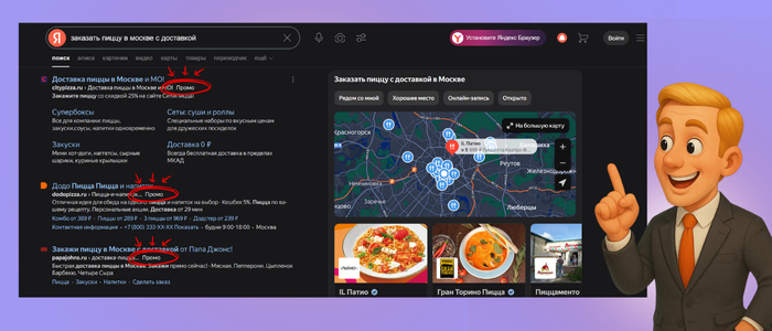 - Поиск: рекламные блоки размещаются прямо над обычными результатами.