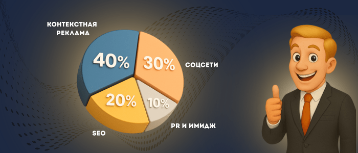 Берём 10% → 100 000 рублей в месяц. Распределяем: 40% контекстная реклама, 30% соцсети, 20% SEO, 10% PR и имидж.