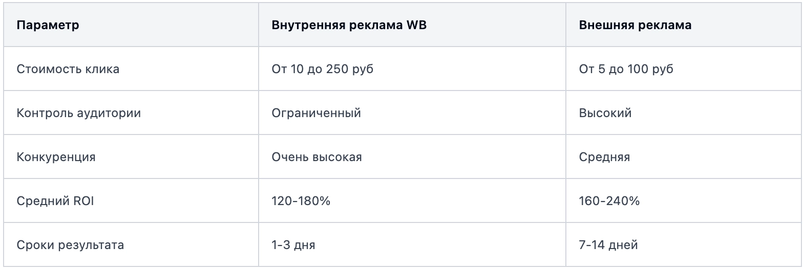 За последние три года я провел десятки экспериментов по сравнению эффективности внутренней и внешней рекламы для разных категорий товаров на WB. Вот что показывает мой опыт: