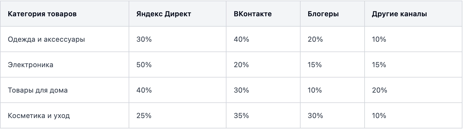 Для разных категорий товаров я рекомендую разное распределение бюджета: