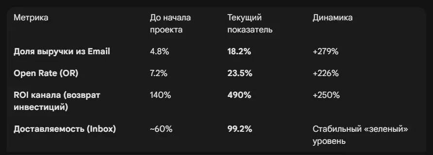 Главный инсайт проекта: Оказалось, что сокращение частоты массовых рассылок в пользу точечных триггеров не уменьшает, а увеличивает доход. Мы перестали «выжигать» базу, что позволило снизить отток подписчиков (Churn Rate) в 2.5 раза.