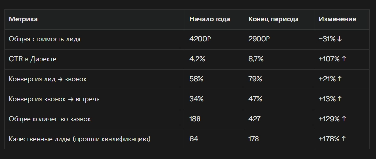 Итог: Конверсия сайта выросла с 2,1% до 3,8%. Это почти двукратный рост эффективности на том же объеме трафика.