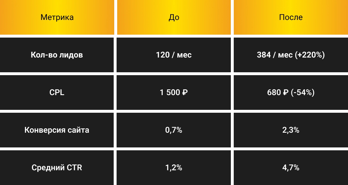 - Отзыв клиента: «Мы впервые почувствовали стабильный поток заявок с сайта. Теперь онлайн‑каналы дают 60% от всех обращений.»