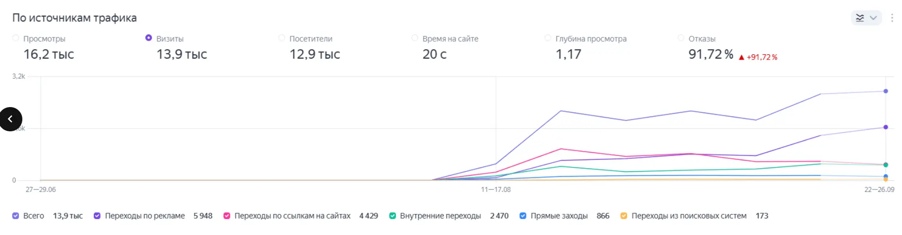 По Метрике: 13 900 визитов, 5 948 переходов с рекламы, 4 429 визитов по ссылкам, 173 — из поиска.