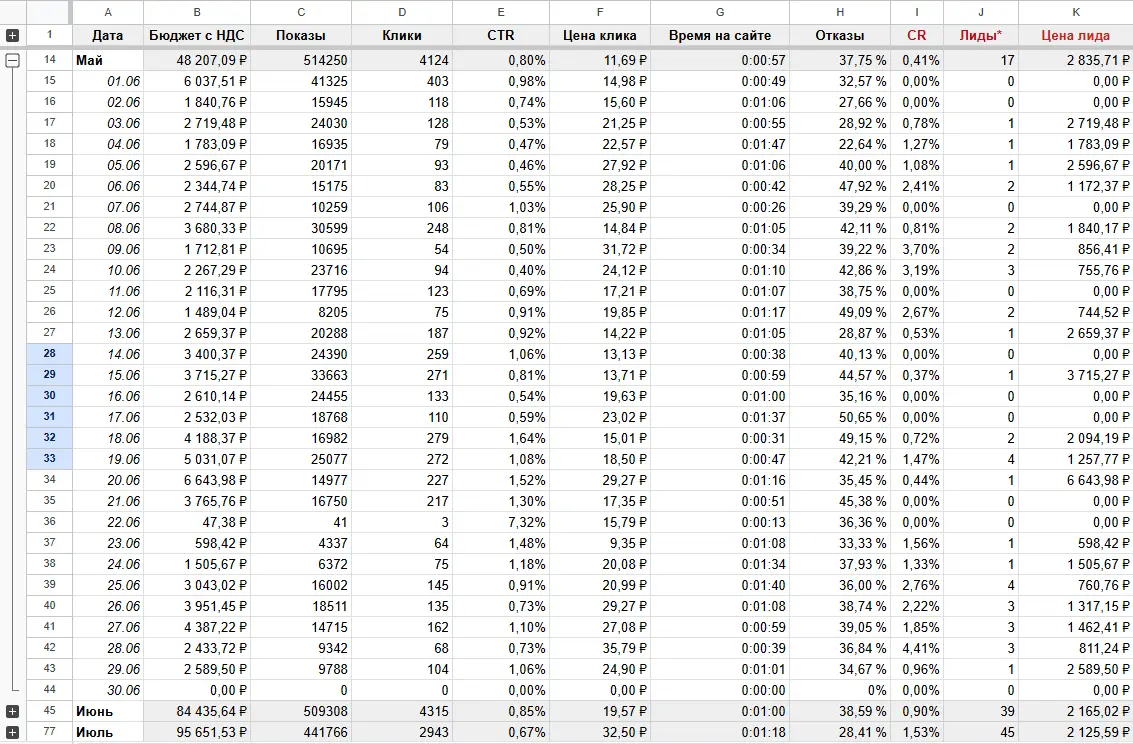 - Июль: 95 651,53 ₽, 2 943 клика, 45 лидов, CPL 2 125,59 ₽.