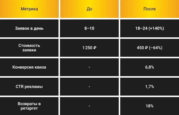 Снизить стоимость заявки с 1 250 ₽ до 450–500 ₽ и обеспечить стабильный поток от 15 заявок в день из VK.