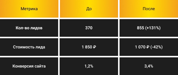 Комплексный подход с сегментацией целевой аудитории и оптимизацией рекламных каналов позволил снизить стоимость лида на 42% и увеличить количество заявок более чем в 2 раза.