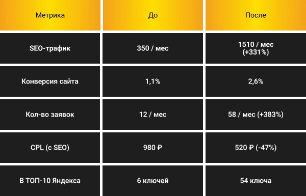 - SEO велось формально, без кластеризации и НЧ‑ключей